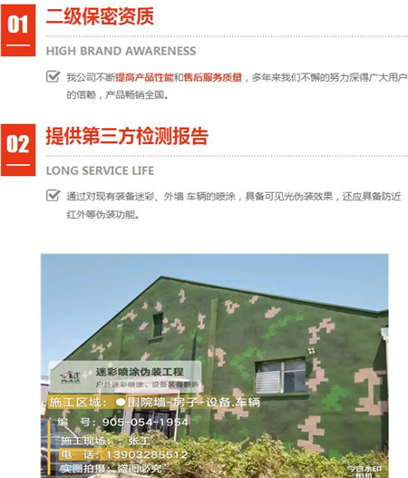 多年經(jīng)驗偽裝波段范圍:可見光(380nm~760nm)和近紅外(760nm~1200nm); 外墻迷彩漆不是水漆。盡管水漆是一種環(huán)保型的涂料,;